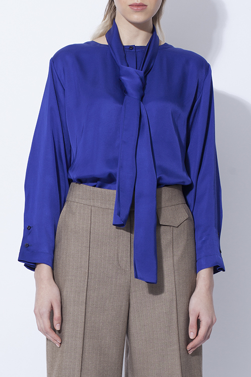 Блуза из легкой струящейся вискозы объемного силуэта с рубашечным рукавом на очень низкой пройме. Особенности - застежка в складке внизу рукава, наличие пояса - кушака, который может использоваться как галстук.