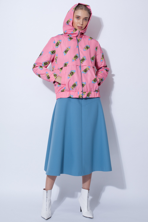 Бомбер из плащевой принтованной ткани на х/б подкладке, простеганной тонким утеплителем. Особенности - отлетная кокетка по полочке и спинке, карманы "листочки" заходящие под кокетку, застежка молния, капюшон. Тренд - бомбер от кутюр, "спорт шик".