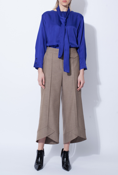 Брюки из костюмной поливискозной ткани со стретчем "елочка". Брюки укороченные, достаточно широкие, с небольшим клешем к низу. Карманы наклонные с отрезным бочком, на полочке под поясом - клапан. Низ брюк спереди оформлен ассиметрично - двумя наложенными друг на друга деталями. Рекомендуется носить в комплекте с жакетом и жилетом из этой же ткани. Тренд - ассиметрия в классическом костюме, элементы мужского костюма в женском.