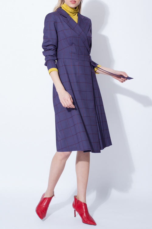Платье из жаккардовой костюмной поливискозной ткани в клетку приталенного силуэта с пиджачным воротником, втачным рукавом, со складками в нижней части правой полочки, исходящими из подреза. Тренд - ассиметрия в классическом костюме, элементы мужского костюма в женском.