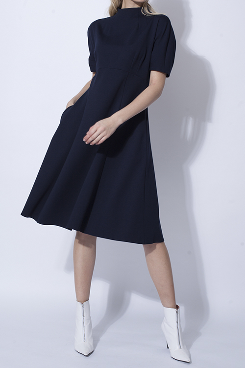 Платье из вискозного джерси изящного силуэта - прилегающее по талии, с широкой юбкой из клиньев, с цельнокроенными рукавами и красиво выведенной стойкой. Сочетает в себе изящество, красоту и удобство, создаваемое трикотажем.