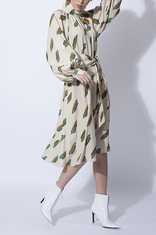 Платье из принтованной вискозной ткани силуэта трапеция с широкими рукавами реглан, с высокой стойкой и манжетами, застегивающимися на петли и пуговицы. Имеются карманы в боковых швах. По горловине и низу рукава - сборка. Воланы, сборки, драпировки в сочитании с простой четкой формой - тренд сезона. Платье может носиться как с поясом, формируя приталенный силуэт, так и без него.