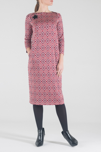 Платье из вискозного жаккардового трикотажа с геометрическим рисунком свободного объема прямого силуэта зауженного к низу. Имеются карманы в рельефах. Очень комфортное за счет материала платье на любой тип фигуры.