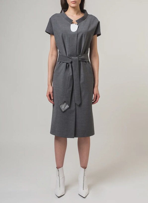 Платье из костюмной ткани п/прилегающего силуэта с широкой планкой застежкой, переходящей в складку. Карманы в рельефах, воротник стойка. «Фишка» - пояс-галстук, элемент из мужского костюма.