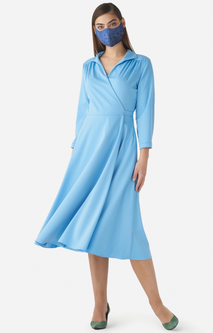 Платье из тонкой поливискозы стретч, отрезное по линии талии, с запахом и притачным поясом. Низ рукава оформлен манжетой с застежкой, элегантный воротник "апаш", по кокетке спереди и на спинке проходит сборка, юбка клёш, в боковых швах - карманы. Тренд - Shaker Dress, 80-е. В тренде ретро стилистика, сборки, воланы, приталенные платья с широкой юбкой.