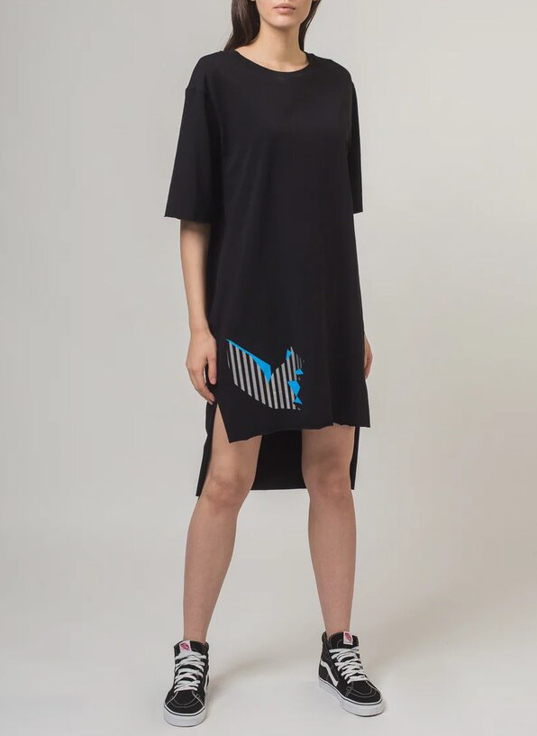 Туника из х/б с эластаном трикотажа прямого силуэта с разрезами по боковым швам и ассиметричным низом. На полочке внизу принт - "белочка" - символ дома моды. Тренд – мягкость, безопасность, комфорт, все это обеспечивает трикотаж